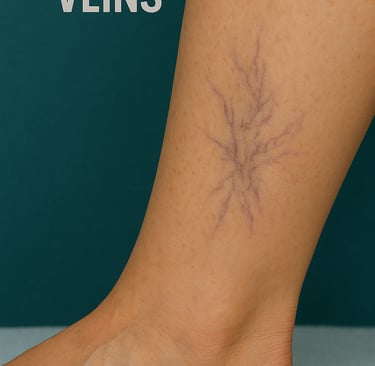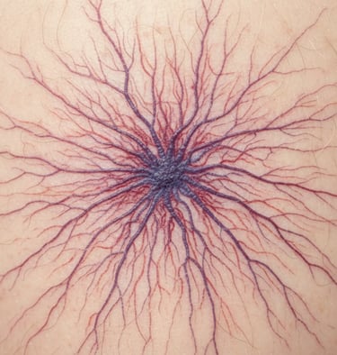 Spider veins (telangiectasias) are dilated, small blood vessels visible just beneath the skin, presenting as fine red, blue, or purple lines and clusters most often seen on the legs and face. Although typically benign and primarily a cosmetic concern, their development can occasionally indicate underlying venous hypertension or early venous insufficiency.